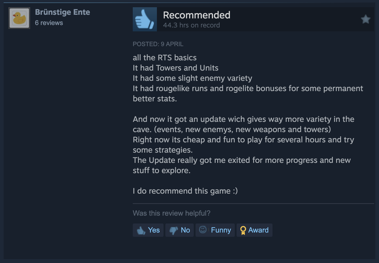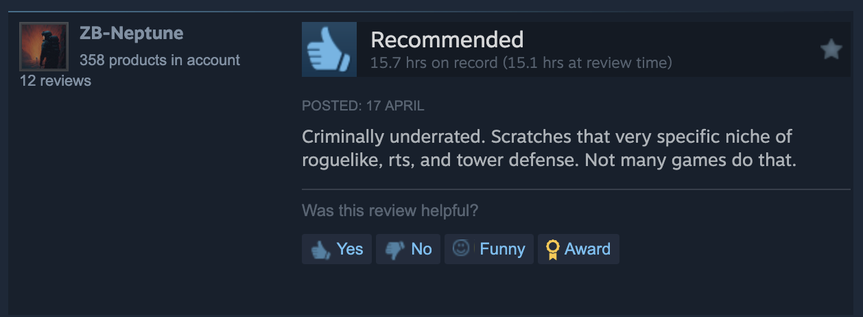 A challenging survival RTS roguelite about surviving against thousands of enemies. Start each run with the hopes of going as deep as you can. Customize your army with different weapons, armour and upgrades. When you inevitably fail, use the knowledge gained to make your next attempts stronger through meta progression upgrades.